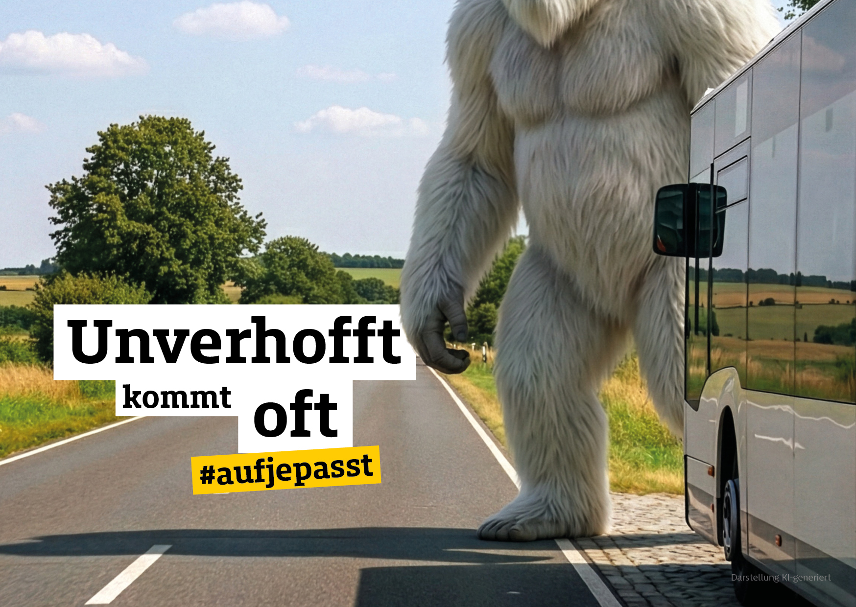 Ein anfahrbereiter Bus schränkt die Sicht enorm ein. Deshalb gilt: Schrittgeschwindigkeit, wenn Fahrgäste nicht einsehbar sind – oder besser warten, bis der Bus wieder losfährt. Denn hinter dem Fahrzeug können sich Menschen befinden, die unvermittelt auf die Fahrbahn treten.